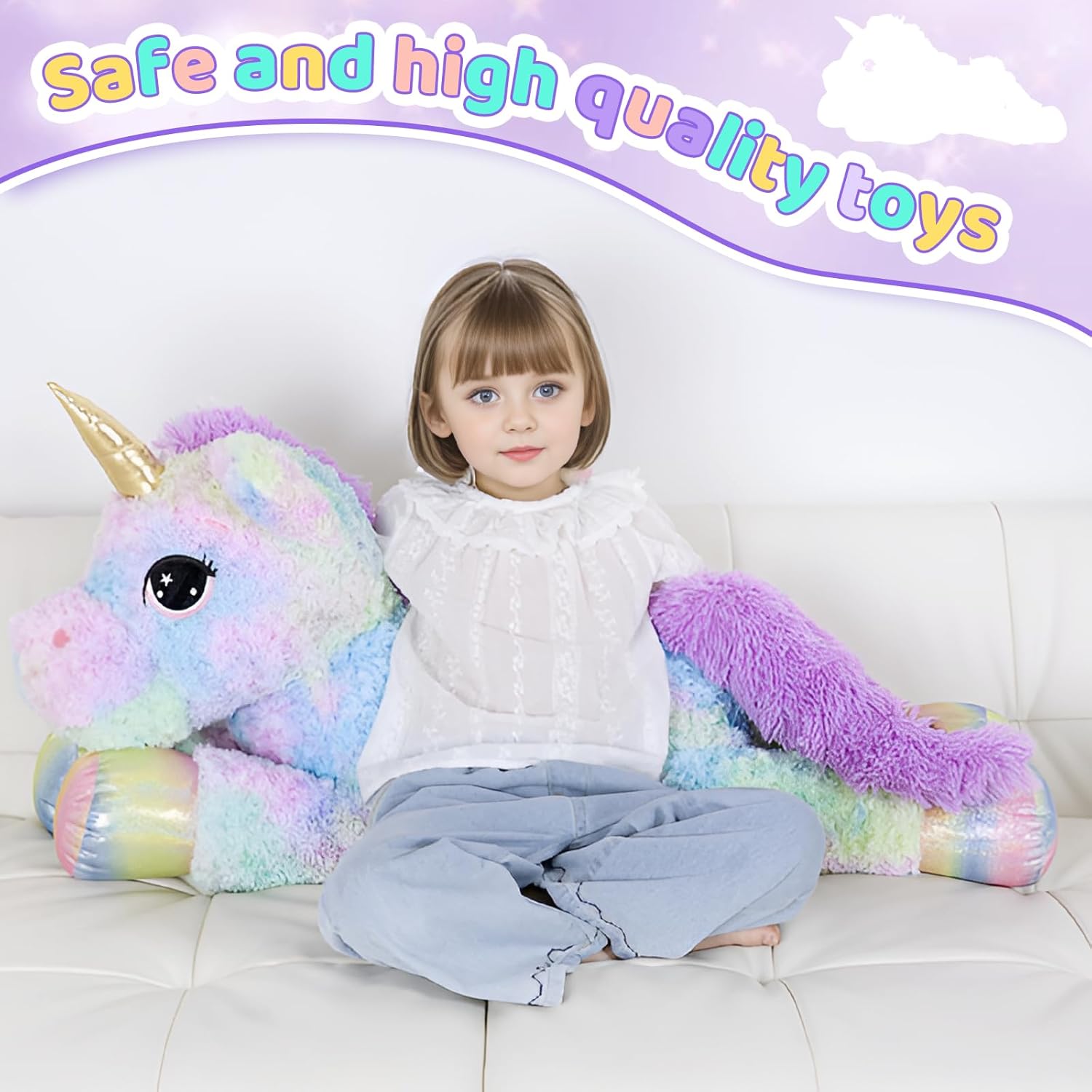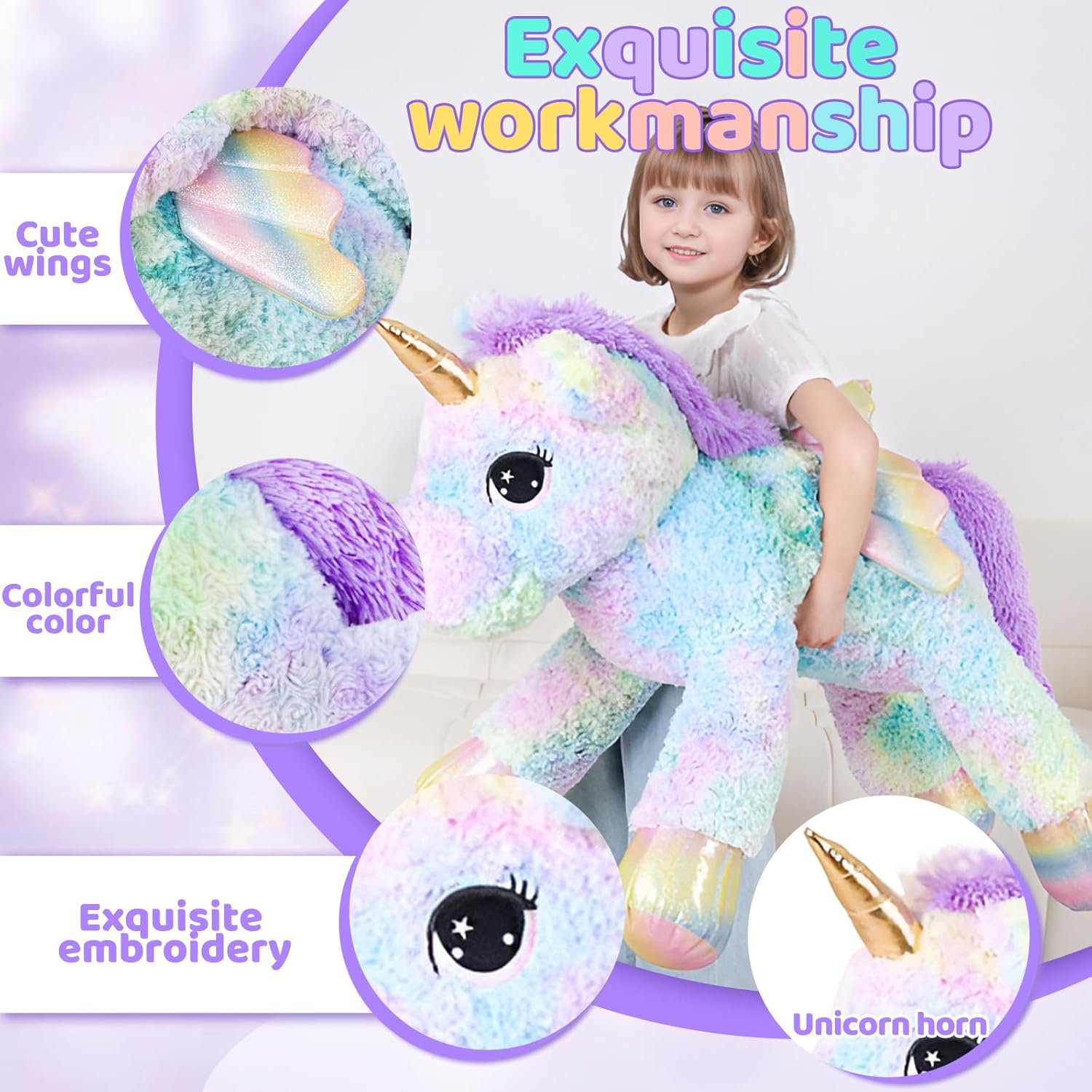 DESIGN FEATURES: Adorable plush unicorn with pastel rainbow-colored fur, shimmering wings, and metallic gold horn accents
