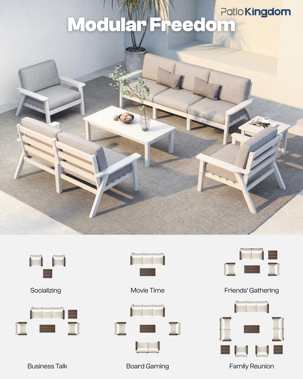 ERGONOMIC & MODULAR COMFORT: Patio Kingdom outdoor sofa sets feature a 105° angled backrest and double-layer high-resilience foam for lasting support and comfort. Adults can stretch out while kids move freely. The 3-seat sofa combines 2 single armchairs + 1 armless chair, and the 2-seat sofa uses 2 single armchairs, allowing flexible layouts for patio conversation sets, patio couches, or outdoor sofas.