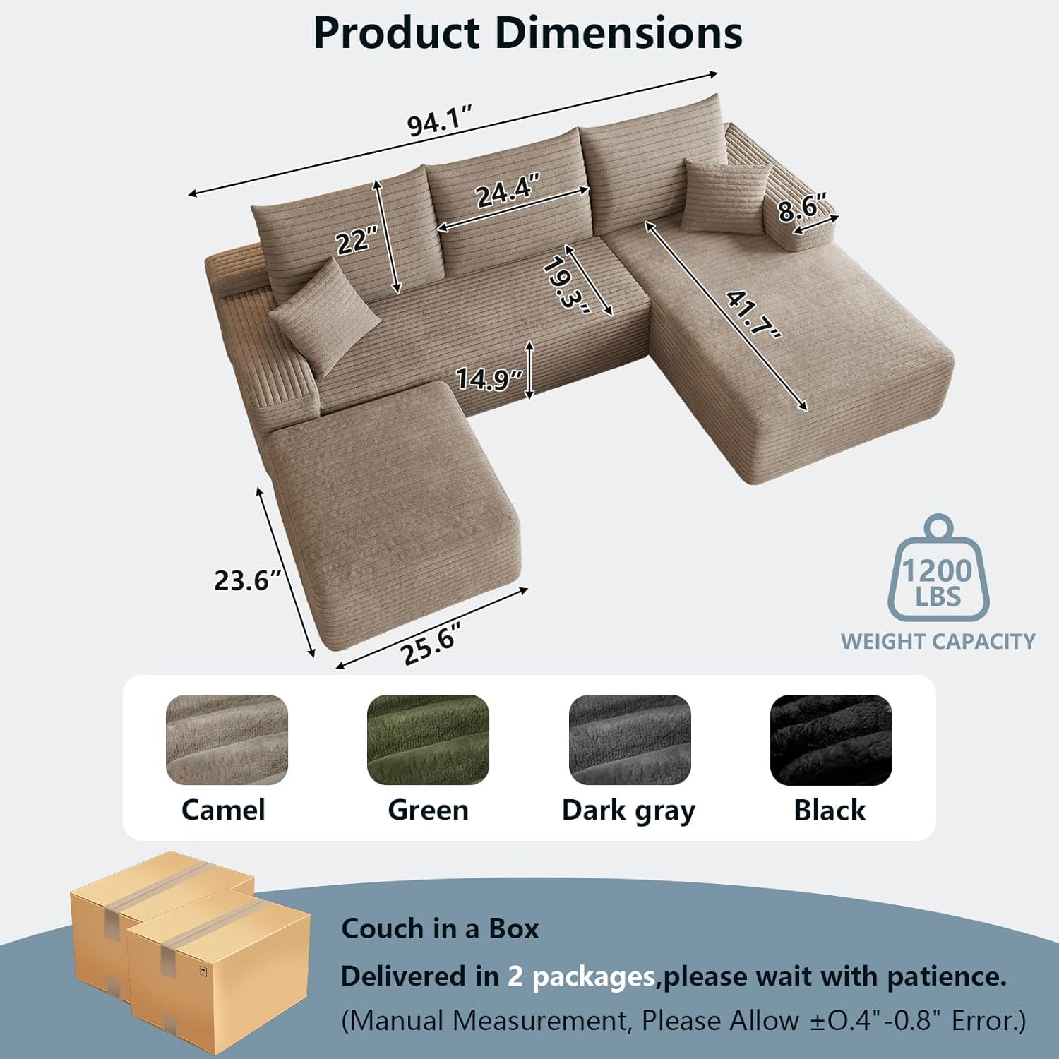 Compact & Space-Saving Design: Ideal for any room, from small apartments to spacious living areas, this modular sofa is designed to maximize space while providing plenty of seating. Its compact design allows for easy navigation through narrow hallways and doorways, while still offering ample room for relaxation. Note: The sectional is shipped in 2 separate packages, which may arrive at different times.