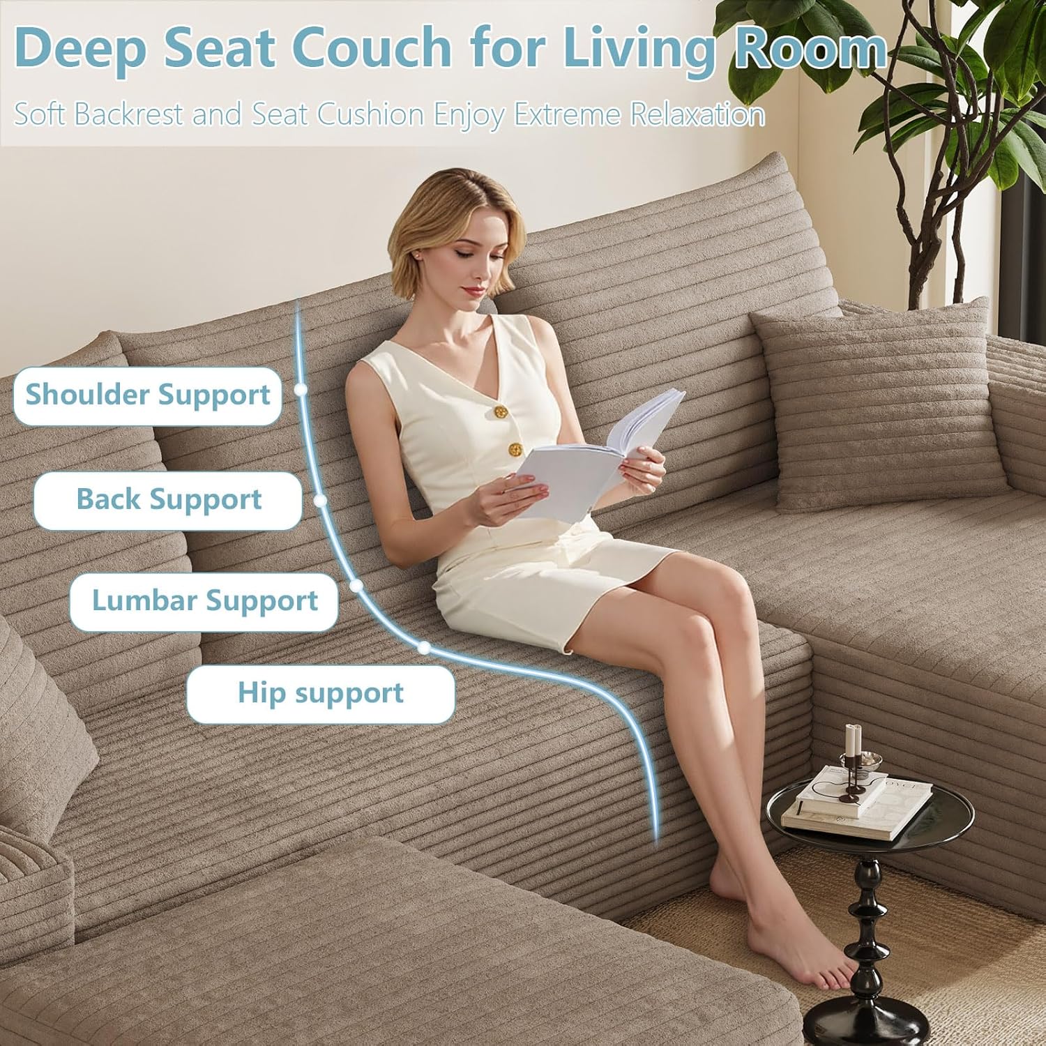 Luxurious Corduroy Upholstery: Sink into luxury with our high-quality corduroy fabric, designed to be soft, breathable, and durable. This skin-friendly material provides a comfortable seating experience while adding a sophisticated touch to your décor. The sofa comes with 3 large cushions and 2 throw pillows, enhancing both comfort and longevity. It’s a perfect combination of modern style and functional comfort for your home