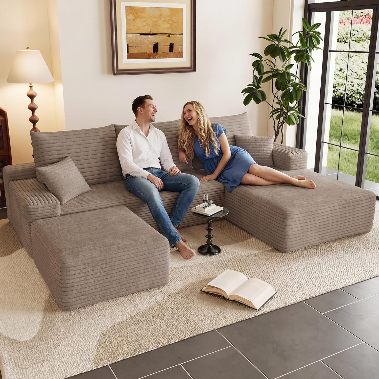 95″ Cloud Sectional Couch with Ottoman,Modern U-Shaped Cloud Couch with Deep Seat,Comfy Corduroy 3-Seater Sofa,Memory Foam Sofa for Living Room,No Assembly (Camel,Right-Facing Chaise)