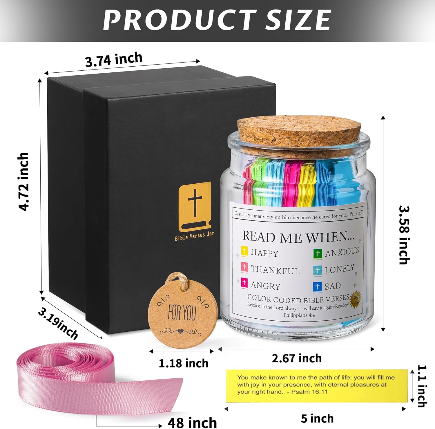 【Well-designed】Our bible verse jar is made of thickened glass, making it more sturdy. The verse card comes with a protective film, which is waterproof and tear proof,designed for long-term, repeated use, Each stylish gift box contains with a 48-inch ribbon for a cute bow. It perfectly meets your gift-giving requirements.