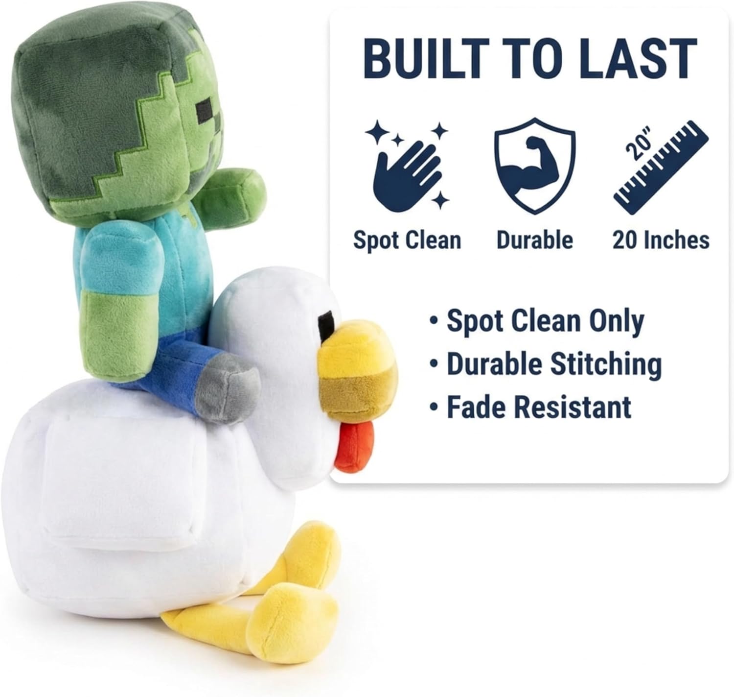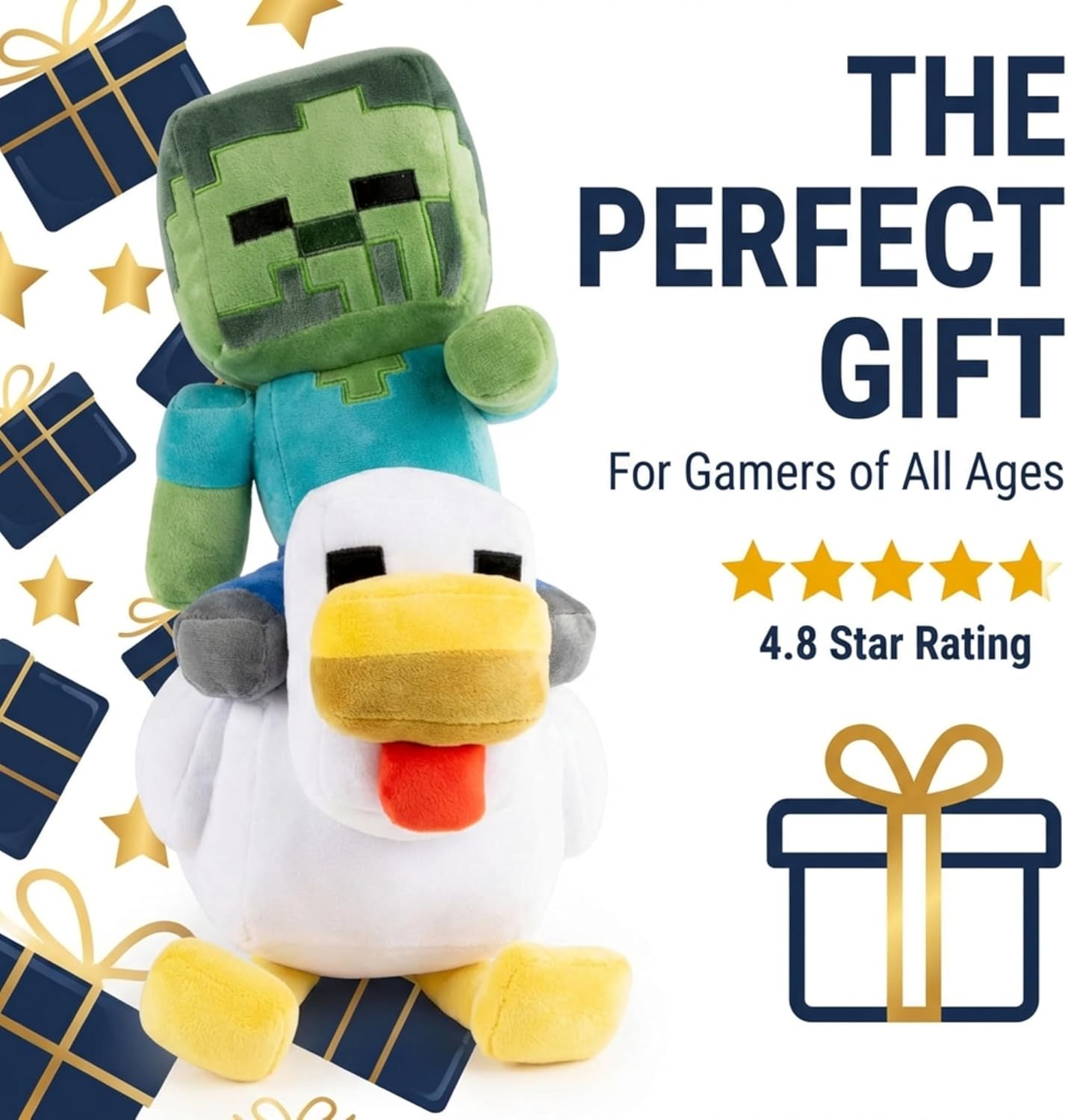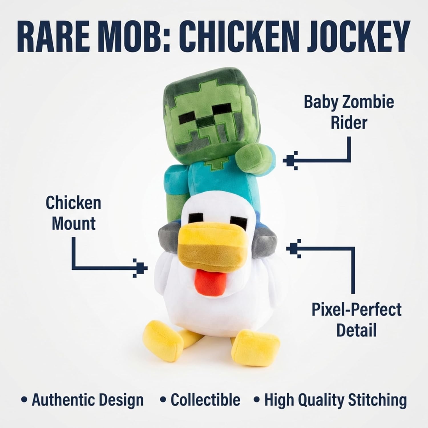 ICONIC DESIGN: Featuring the rare and quirky Chicken Jockey from Minecraft—a baby zombie riding a chicken—this ultra-soft and detailed plush captures the fun and unexpected charm of the game, making it a unique and playful addition to any fan’s room décor or collection.