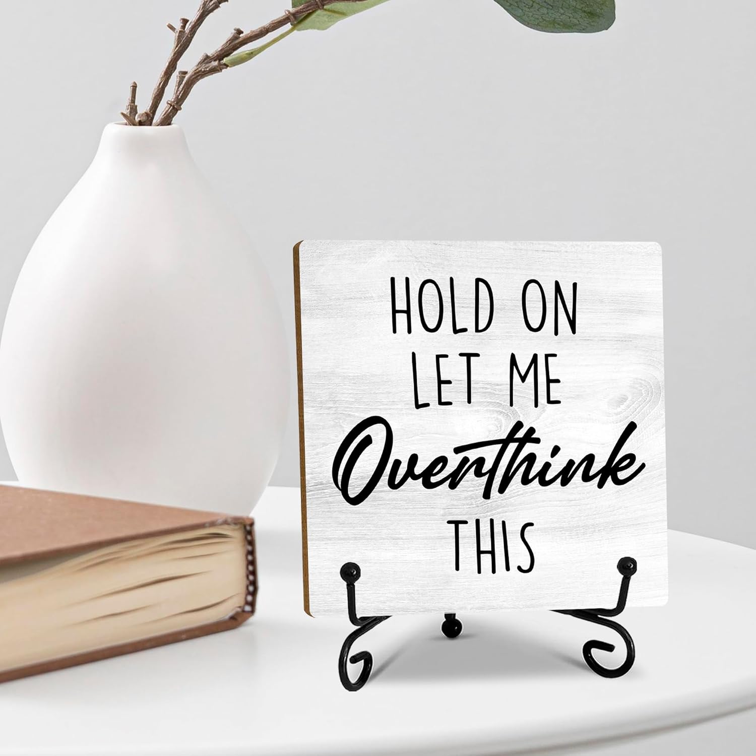 Reminder Wooden Sign – Hold On,Let Me Overthink This – That Desk Decor Sign With Stand, Home Office Decor Funny Gifts Office Rustic Table Desk Decor Accessories & Supplies, 5X5 Inches-A50