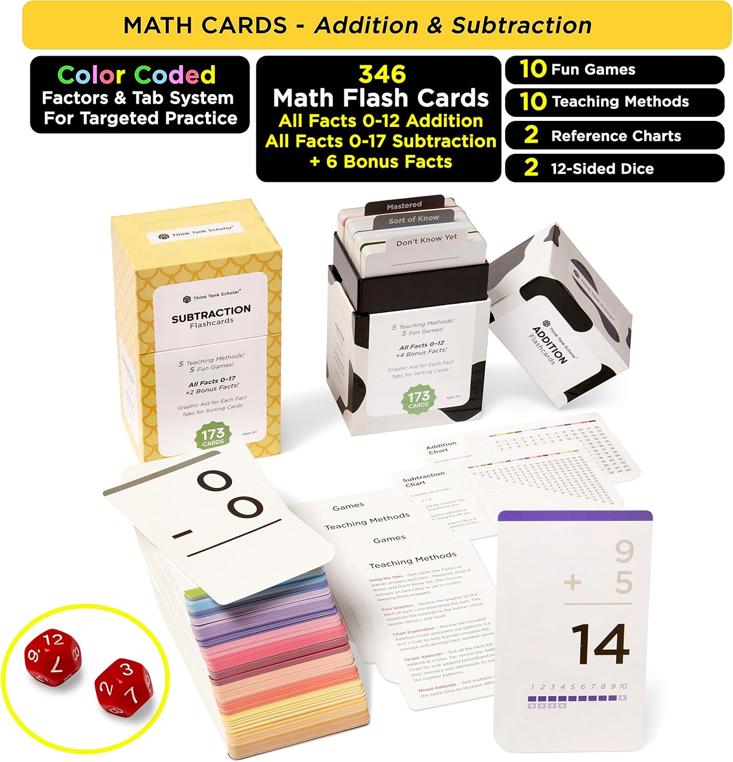 ADDITION & SUBTRACTION MASTERY TOOLKIT: Comprehensive bundle featuring 722 addition and subtraction math equations (all facts 0-12), triangular cards deliver four equations per card while single-fact cards deliver one fact per card, a pair of 12-sided quizzing dice, 3 bonus facts, 6 teaching methods, 11 fun games, and reference tables, designed to boost fact recall and math literacy for kindergarten, first, second & third grade students while making learning engaging and enjoyable.